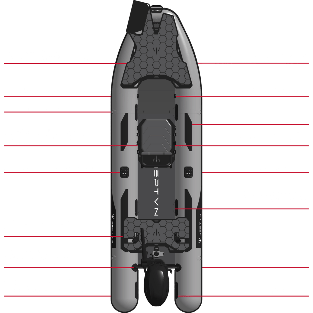 Am Rumpf des NEPTVN PRO 400 sind 14 permanente D-Ringe angeschweißt. 5 große D-Ringe am Schlauch dienen als Ankerpunkte und Transportspannpunkte, 9 kleine D-Ringe am Dropstitch-Boden ermöglichen die modulare Befestigung der Stehhilfe und der Heckkonstruktion. Alle D-Ringe sind aus Edelstahl gefertigt und daher extrem langlebig.